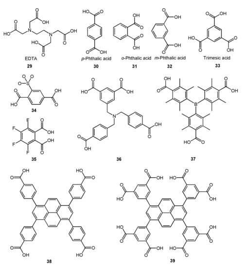 However, the metal complexes with polycarboxyl compounds as ligands are easy to form coordination polymers and metal-organic frameworks (MOFs) because of the super coordination ability of carboxyl oxygen atoms [58,60,61,62]. For instance, Erkarslan group and Feng group synthesized 1D chain polymer with near-infrared luminescence using modified polycarboxylic acid compounds 34 and 35 (Figure 10) in coordination with lanthanide ions, respectively (Figure 12) [60,62]. To obtain coordination compounds with better photophysical and photochemical properties, some functional groups with specific functions are introduced into organic ligands, e.g., from compound 36 to compound 39 (Figure 10), tertiary amino group, boron, and pyrene group were introduced, respectively, and they all fulfilled specific functions [14,59,61]. However, they still use carboxyl groups for coordination and the molecule contains multiple carboxyl groups, so these complexes are mainly polymers.