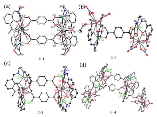 A view of the molecular structures of complexes (a) C-1; (b) C-2; (c) C-3; (d) C-4. (a) Reprinted with permission from [52]. Copyright 2016, American Chemical Society; (b–d) Reprinted from [63]. Copyright 2009, with permission from Elsevier.
