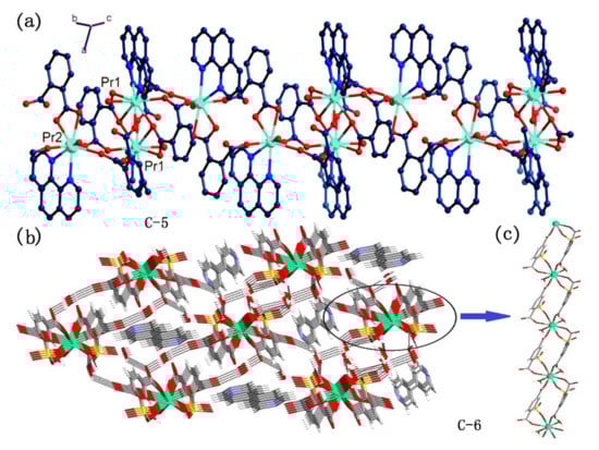 (a) A view of the molecular structure of complexes C-5; (b) a view of 3-D hydrogen bond network of C-6 in bc plane. Uncoordinated 4,40-bipyridine molecules occupy the channels; (c) a view of 1-D infinite chain along a axis constructed by C-6. (a) Reprinted with permission from [60], Copyright 2019, Feng, X. et al. (b,c) Reprinted from [62], Copyright 2016, with permission from Elsevier.