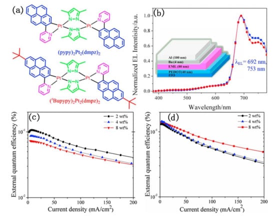 (a) The structure of (pypy)2Pt2(dmpz)2 and (tBupypy)2Pt2(dmpz)2; (b) electroluminescent (EL) spectra of the of (pypy)2Pt2(dmpz)2 and (tBupypy)2Pt2(dmpz)2-based devices. Inset: The diagram of the EL devices; (c,d) are the external quantum efficiency (EQE) curves of the (pypy)2Pt2(dmpz)2- and (tBupypy)2Pt2(dmpz)2-based devices at different dopant concentrations from 2 wt% to 8 wt%. Reprinted from [81], Copyright 2016, with permission from Elsevier.