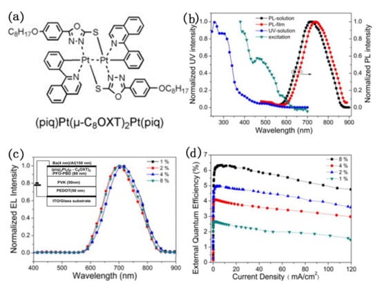 (a) The structure of (piq)2Pt2(μ-C8OXT)2; (b) Absorption and PL spectra of (piq)2Pt2(μ-C8OXT)2; (c) EL spectra and (d) EQE curves of the (piq)2Pt2(μ-C8OXT)2 -doped PFO–PBD devices with different dopant concentrations. Insert: (c) The diagram of the EL devices. Reprinted from [82]. Copyright 2012, with permission from Elsevier.