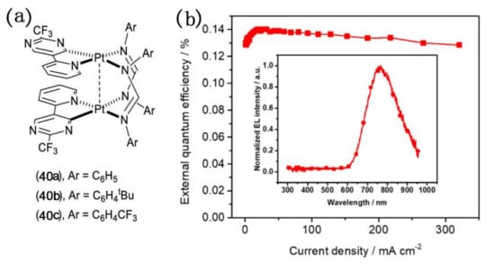 Recently, non-doped OLED devices in which NIR emissive complexes with bridging ligands with electroluminescence properties are directly used as light-emitting layers have attracted attention. In 2019, Wang and co-workers synthesized a series of diplatinum(II) complexes with the molecular formula [Pt(pypm)(μ-Fn)]2 bearing a pyridine-pyrimidinate (pypm) chelate and a formamidinate bridge (Figure 15), in which (pypm)H and FnH stand for 5-(pyridin-2-yl)-2-(trifluoromethyl)pyrimidine and functional formamidines with various substituents of Ph (n = 2) (40a), C6H4tBu (n = 3) (40b), and C6H4CF3 (n = 4) (40c) [77]. 40b was selected as a non-doped emitter for the fabrication of NIR-emitting OLEDs. An electroluminescence NIR peak was observed at 767 nm in EL spectra and the maximum EQE value of 0.14% was obtained in the OLED device. Although the EQE value is too low or even negligible, it has realized the progress of the NIR light-emitting complexes with bridging ligands as a light-emitting layer from being a dopant to the pure substance.