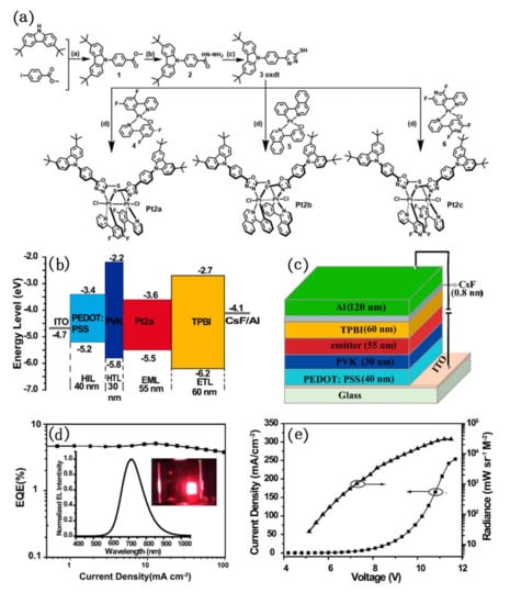(a) The synthetic route of Pt2a–Pt2c; (b) energy-level diagrams, and (c) configuration of the device; (d) EQE curves of the device. Insets: EL spectra and a photograph of thebdevice in operation. (e) Current density−voltage−radiance (J−V−R) curve of the device. Reprinted with permission from [83]. Copyright 2020, American Chemical Society.
