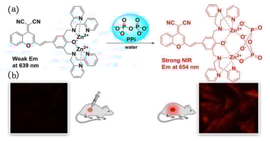 In 2018, Yang et al. found that many fluorescent pyrophosphate (PPi) sensors were developed with emission changes in the visible region, while NIR emissive sensors for PPi were rather scarce [91]. Thereupon, they designed and prepared a dicyanomethylene-benzopyran (DCMB) based phenol-bridged dinuclear Zn(II)-DPA (DPA: Dipicolylamine) complex (1-2Zn) which was found to be a promising NIR fluorescent sensor for PPi. The photo-physical study showed that 1-2Zn had a large Stokes shift (>150 nm) and exhibits unusual NIR fluorescence changes for PPi. Interestingly, upon addition of PPi with increasing amounts from 0 to 0.5 equiv., this emission band decreased gradually and almost linearly, and red-shifted to 654 nm. Whereas, when PPi concentration was further increased, significant NIR fluorescence enhancement was observed at 654 nm. In addition, the authors investigated the potential bioimaging applications of sensor 1-2Zn. As shown in Figure 17, the cells were incubated with PPi and 1-2Zn for 30 min at 37 °C, and a remarkable increase of intracellular fluorescence was observed. The result demonstrated that 1-2Zn had great potential for imaging of PPi in living cells. 1-2Zn sensor in vivo detection of PPi experiment was also carried out. The fluorescence showed obvious enhancement when injection of PPi (1 or 2 eq) to the mouse and incubation with 1-2Zn were conducted, indicating 1-2Zn exhibited the excellent performance to the detection of PPi in vivo.