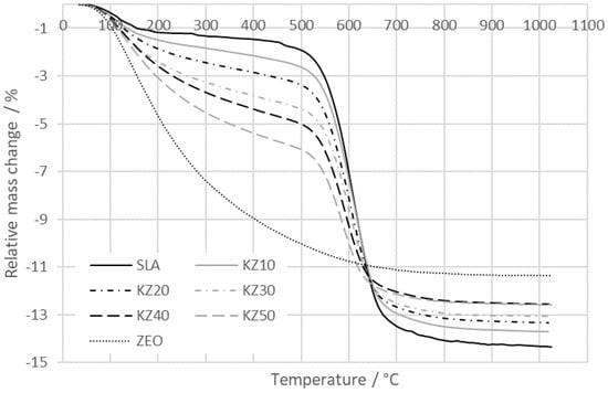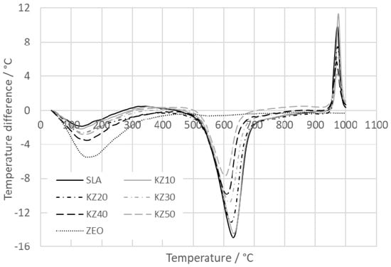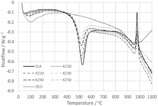 The relative mass changes of the kaolin–zeolite samples are shown in Figure 4. Two significant mass losses occur. The first loss is in the temperature interval from 30 to 250 °C and corresponds to the process of dehydration, during which physically bound water evaporates [23]. The process of dehydration is the least significant for sample SLA (1.56%) and increases with the amount of zeolite (3.98% for sample KZ50). The second mass loss, in the temperature interval from 450 to 700 °C, corresponds to the dehydroxylation of kaolinite [19,48]. The mass loss for sample SLA is 11.35% and it decreases with the amount of zeolite (6.12% for sample KZ50). The mass loss of the zeolite sample decreases continuously up to 800 °C and reaches 11.27%. Then, the mass loss remains almost constant. During the dehydroxylation, the mass loss is only 0.98%. This is because the dehydroxylation does not occur in zeolite. The reason is that zeolite does not have OH− ions in the matrix structure. The DTA, DSC, and TG results of kaolin and natural zeolite are very similar to the results presented in [21,26,49]. In these studies, the mass losses of the kaolinite subgroup and clinoptilolite are in good agreement with our results. For kaolinite, it is in the interval from 11.8% to 13.31% (we obtained 11.35%, but the kaolinite content in kaolin was only 77.8%), and for clinoptilolite, it is 9.54% at 1000 °C (we achieved 11.27%). The obtained difference can be explained by a different content of water in the prepared sample from kaolin or natural zeolite. Moreover, the studied zeolite was not pure clinoptilolite as it also contained the amount of cristobalite, illite with mica, and feldspar.