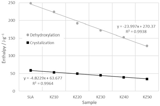 The influence of zeolite in the samples is visible on the enthalpy of reactions (dehydroxylation of kaolinite and Al-Si spinel formation) occurring in the kaolin–zeolite samples during thermal treatment (see Figure 3). The enthalpies were determined from the DSC results (peaks) (see Figure 2). A tangential baseline, which most realistically represents the progress of reactions, was used. The first studied reaction was the dehydroxylation of kaolinite, which is associated with the evaporation of chemically bound water [19,48]. The enthalpy of this reaction decreases linearly with the amount of zeolite in the samples from 248.9 (sample SLA) to 128.1 J/g (sample KZ50). The second reaction was the transformation of metakaolinite into an Al-Si spinel [28]. The values of enthalpy also decrease linearly with the zeolite content, from 58.8 (sample SLA) to 34.4 J/g (sample KZ50).