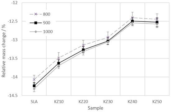 The results of the relative mass change of the kaolin–zeolite samples at temperatures of 800, 900, and 1000 °C are plotted in Figure 5. It is visible that the mass loss of the samples increases with temperature and decreases with the amount of zeolite. At a temperature of 1000 °C, it ranges from 14.3% to 12.6%. The trend of decrease is identical for all three selected temperatures and it is almost linear up to 40 mass% of zeolite. Then, the mass loss for samples KZ40 and KZ50 is comparable (the difference is only 0.04%).