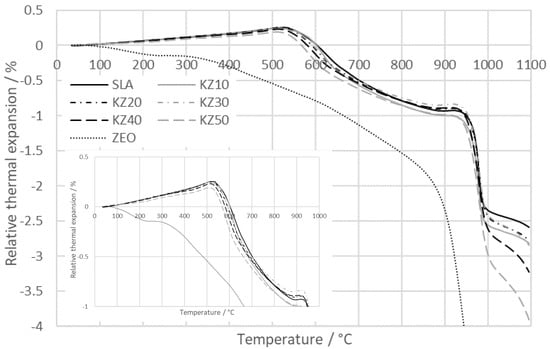 The relative thermal expansion of the kaolin–zeolite samples is shown in Figure 6. In the temperature interval from 30 to 250 °C, the process of dehydration occurs, where physically bound water escapes from the pores and surface of crystals. The length of all samples, except the zeolite sample, increases linearly and reaches about 0.07%. The length of the zeolite sample decreases and its shrinkage is about 0.14%. The expansion of samples decreases with the amount of zeolite. The next process occurring in the studied samples starts at about 500 °C, when the chemically bound water escapes and the structure of kaolinite is transformed into metakaolinite [19,48]. The structure of metakaolinite is similar to the structure of kaolinite. The lattice parameters a and b remain the same, but the parameter c is changed to 0.685 nm. The distance between layers is shorter (about 0.055 nm) than in kaolinite. In addition, it is more defective and less stable than kaolinite [19]. Therefore, the shrinkage of samples in the temperature interval from 500 to 700 °C is observed. Nevertheless, after the dehydroxylation is finished, the contraction continues up to 950 °C due to the sintering process [30]. As a result of the reactions above ~950 °C, there is a rapid contraction of the produced bodies. In the temperature interval from 700 to 1100 °C, the sintering process occurs as well. Therefore, this shrinkage is caused by both processes. The total shrinkage of the kaolin–zeolite products increases with the amount of zeolite from 2.59% for sample SLA to 3.91% for sample KZ50. Similar behavior of thermal expansion of kaolin samples was also obtained in [50,51]. The shrinkage of kaolin samples reached 2.5% and 3.2% at 1100 °C, respectively, which is in good agreement with our results.