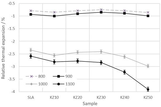 Relative thermal expansion of the studied samples at 800, 900, 1000, and 1100 °C.