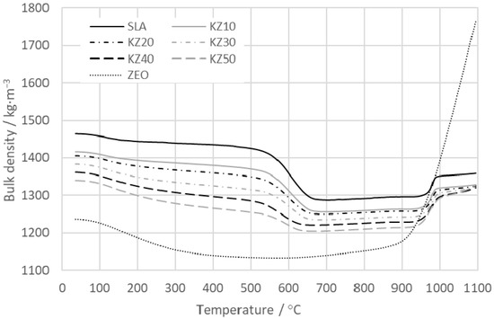 The results of the bulk density of the kaolin–zeolite samples are shown in Figure 8. The bulk density decreases with the amount of zeolite and also with the temperature increase to 650 °C. The bulk density for the green SLA sample is 1464 kg·m−3, and for the green KZ50 sample, it amounts to 1340 kg·m−3. The first significant decrease is up to 250 °C, which is caused by the liberation of physically bound water [23]. Then, the bulk density decreases almost linearly until the dehydroxylation of kaolinite starts (at about 500 °C) [19,48]. The structural changes (transformation of kaolinite into metakaolinite) cause the decrease in the bulk density. This decrease occurs due to an intensive mass loss (11.35% for sample SLA) (see Figure 4) and contraction (0.68% for sample SLA) (see Figure 6). During dehydroxylation, the bulk density decreases from 135 kg·m−3 for sample SLA to 50 kg·m−3 for sample KZ50. After dehydroxylation, the bulk density slightly increases for all studied samples up to 950 °C. Then, a sharp increase occurs due to the transformation of metakaolinite into the spinel phase [28]. Above 1000 °C, the bulk density increases only slightly. At 1100 °C, the values of the bulk density are lower than for the green samples. The differences are from 11 kg·m−3 for sample KZ50 up to 106 kg·m−3 for sample SLA, which means that the difference decreases with the zeolite content.