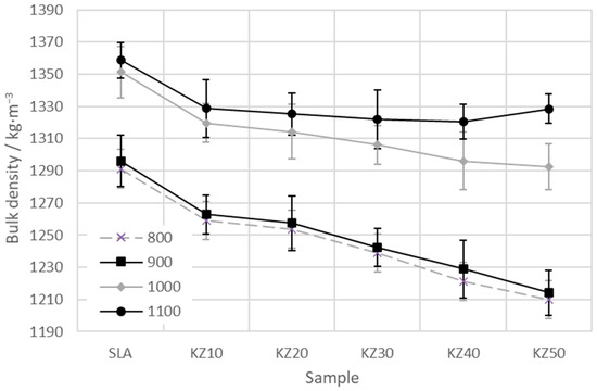 The bulk density of kaolin–zeolite samples at different temperatures is shown in Figure 9. The results show that the bulk density at temperatures of 800 and 900 °C decreases with the amount of zeolite. The differences between the SLA and KZ50 samples are about 40 kg·m−3 at 800 °C and about 60 kg·m−3 at 900 °C. The values of the bulk density at the temperatures of 1000 and 1100 °C also decrease, almost linearly in this case, except for sample KZ10. Those results show that the bulk density decreases with the zeolite content by about 6%.