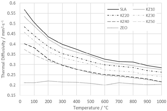 The results of the thermal diffusivity of the kaolin–zeolite samples in the temperature interval from 30 to 1000 °C are plotted in Figure 10. The thermal diffusivity of the green samples decreases with the amount of zeolite from 0.57 mm2∙s−1 for sample SLA to 0.37 mm2∙s−1 for sample KZ50. The green zeolite sample has a thermal diffusivity of only 0.21 mm2∙s−1. The thermal diffusivity of all studied samples decreases with temperature, except for the zeolite sample. The thermal diffusivity of the zeolite sample is almost the same in the whole temperature range (0.21 mm2∙s−1). The decrease in thermal diffusivity is caused by the escape of physically and chemically bound water in the samples (dehydration and dehydroxylation) [19,23,48]. The differences in thermal diffusivity between samples also decrease with temperature. They are 0.20 mm2∙s−1 for the green samples at room temperature and 0.07 mm2∙s−1 for the samples measured at 1000 °C. A similar decreasing trend of the thermal diffusivity of clays was obtained in [17,49]. The values were from 0.17 to 0.27 mm2∙s−1. A more interesting study was published by Antal et al. [49], where the thermal diffusivity of textured kaolin samples was assessed. It is visible that the thermal diffusivity of kaolin samples depends significantly on the direction of crystal orientation. The results showed that thermal diffusivity is in the interval from 0.2 to 0.75 mm2∙s−1 measured at room temperature and from 0.15 to 0.4 mm2∙s−1 at the temperature of 1100 °C.