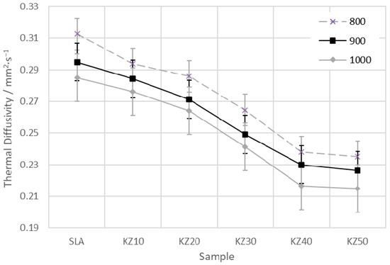 The thermal diffusivity of the kaolin–zeolite samples at different temperatures is shown in Figure 11. The thermal diffusivity decreases with the amount of zeolite up to 40 mass%. Sample KZ50 has almost the same value of thermal diffusivity as sample KZ40. All three curves (the results at 800, 900, and 1000 °C) exhibit the same trend. At a temperature of 1000 °C, samples KZ40 and KZ50 have values of thermal diffusivity similar to the zeolite sample. The difference is only 0.01 mm2∙s−1.