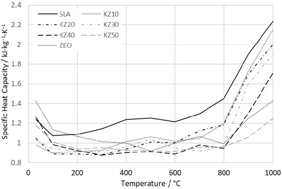 The results of the specific heat capacity of the kaolin–zeolite samples during thermal treatment up to 1000 °C are shown in Figure 12. The heat capacity of the green samples is in the interval from 1.02 to 1.42 kJ∙kg−1∙K−1. The values of the heat capacity for all samples decrease when the liberation of physically bound water is finished. The heat capacity of water is 4.2 kJ∙kg−1∙K−1 (much higher than for solid materials); therefore, its decrease was expected in the temperature interval up to 300 °C. Then, the specific heat capacity of samples slightly increases up to 800 °C. The values are in the interval from 0.88 to 1.45 kJ∙kg−1∙K−1. The dehydroxylation of kaolinite also influences the heat capacity of samples. The OH− groups are removed from the structure of kaolinite, and therefore, the heat capacity does not increase, as it is excepted from the Debye model. Above 800 °C, a sharp increase in the heat capacity occurs due to crystallization of spinel [28] and a normal characterization of the heat capacity at higher temperatures. At a temperature of 1000 °C, the specific heat capacity of the samples ranges from 1.25 up to 2.24 kJ∙kg−1∙K−1, which is about 50% higher than it was for the green samples. Michot et al. [53] studied the heat capacity and thermal conductivity of kaolinite/metakaolinite in the temperature interval from room temperature up to 1000 °C. Their results showed that the heat capacity of metakaolinite above the temperature of 700 °C is about 1.2 kJ∙kg−1∙K−1, which is lower than our values. This can be explained by a different content of kaolinite in our kaolin sample and the application of a method which is not accurate for measurement of heat capacity.