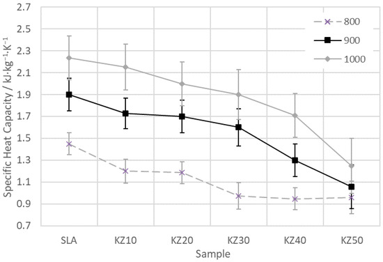 The specific heat capacity of the kaolin–zeolite samples at temperatures of 800, 900, and 1000 °C is presented in Figure 13. The heat capacities of samples KZ30, KZ40, and KZ50 at 800 °C are almost the same. At temperatures of 900 and 1000 °C, the trend of the heat capacity is similar. Zeolite in the samples causes a decrease iin the specific heat capacity. The difference between samples SLA and KZ50 at 1000 °C is 0.99 kJ∙kg−1∙K−1, which is about 80%.