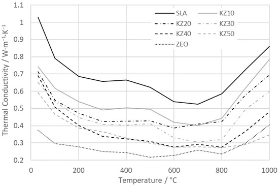 The results of the specific heat capacity of the zeolite–kaolin samples during thermal treatment up to 1000 °C are shown in Figure 14. The thermal conductivity of the green samples (at 30 °C) is the highest for sample SLA (1.03 W∙m−1∙K−1) and the lowest for the zeolite sample (0.37 W∙m−1∙K−1). It decreases with the amount of zeolite. Then, in the temperature interval from 30 to 300 °C, the thermal conductivity of all studied samples decreases due to the liberation of physically bound water from the pores and crystal surfaces (water has a higher thermal conductivity than ceramic materials) [23]. Significant changes are observed in the temperature interval from 400 to 700 °C. This decrease is caused by dehydroxylation of kaolinite [19,48] and it is smaller with higher zeolite content in the samples. At 700 °C, all samples reach the lowest values of thermal conductivity, which range from 0.52 (sample SLA) to 0.25 W∙m−1∙K−1 (the zeolite sample). Above the temperature of 800 °C, a sharp increase in the thermal conductivity occurs due to the sintering process and crystallization of spinel [28]. The final values at 1000 °C are from 0.86 W∙m−1∙K−1 for sample SLA to 0.35 W∙m−1∙K−1 for sample KZ50. The results obtained by Michot et al. [53] showed a thermal conductivity of the green kaolin body of up to 0.5 W∙m−1∙K−1, which is in good agreement with the value of 0.52 W∙m−1∙K−1 obtained in this study. On the other hand, our values of thermal conductivity were not measured but calculated from density, heat capacity, and thermal diffusivity. The surface of samples was coated by graphite before the analysis, and above 800 °C, graphite could burn out, although the analysis was performed in nitrogen atmosphere. Therefore, greater uncertainties are expected.