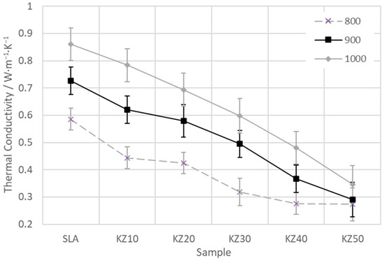 The thermal conductivity of the kaolin–zeolite samples at temperatures of 800, 900, and 1000 °C is shown in Figure 15. At a temperature of 800 °C, thermal conductivity has a decreasing trend up to 40 mass% of zeolite. Nevertheless, samples KZ40 and KZ50 have similar values of thermal conductivity (the difference is only 0.003 W∙m−1∙K−1). At temperatures of 900 and 1000 °C, thermal conductivity decreases with the amount of zeolite and this decrease is almost linear. The difference between samples SLA and KZ50 at 1000 °C amounts to 0.45 W∙m−1∙K−1, which is about 53%. Typically, values of the thermal conductivity of ceramic materials are in the interval from 0.28 to 1.2 W∙m−1∙K−1 [53]. Therefore, the obtained results of the thermal conductivity are in good agreement with the literature.
