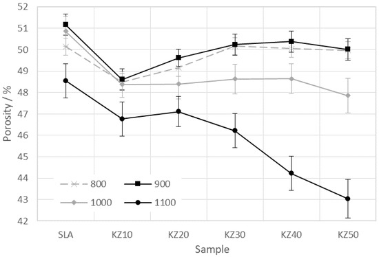 The results of bulk density were also confirmed with the results of the porosity of kaolin–zeolite samples at temperatures of 800, 900, 1000, and 1100 °C (see Figure 16). The porosity of the studied samples decreases and the bulk density increases with temperature. The porosity at 800 and 900 °C decreases when the sample contains 10 mass% of zeolite. Then, the porosity increases and reaches about 50% for samples KZ30, KZ40, and KZ50. The porosity of sample KZ10 at temperatures of 800, 900, and 1000 °C is almost the same. At a temperature of 1100 °C, porosity decreases from 48.5% (sample SLA) down to 43.0% (sample KZ50). The decrease in the porosity with temperature is caused by the sintering process in the samples [30]. This process causes a decrease in the sample volumes and vanishing of pores. The results show that the porosity decreases with the amount of zeolite in the samples.
