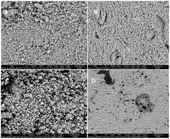 SEM pictures. (A) green Sedlec kaolin; (B) Sedlec kaolin fired at 1100 °C; (C) green zeolite; (D) zeolite fired at 1100 °C.
