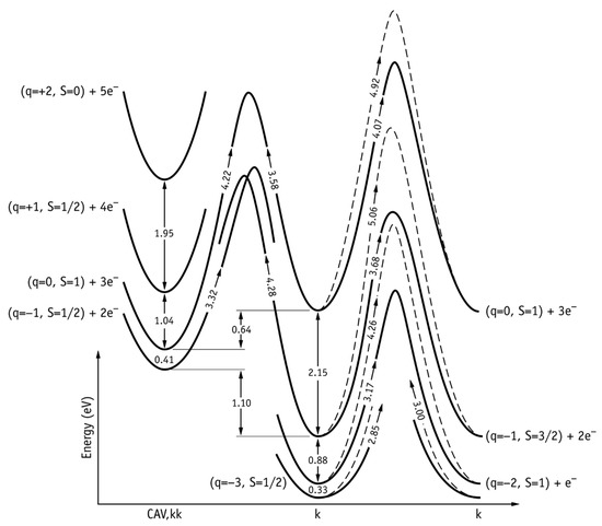 On the other hand, if a defect is found in n-type 4H–SiC without an external bias, it will be “eager” for electrons. First of all, it will quickly capture two electrons and become negatively charged, . Further energy lowering is only possible by overcoming a 3.3 eV barrier via . After that, additional electrons can be captured depending on the Fermi level.