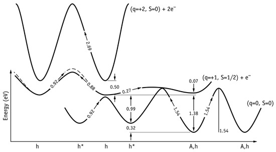 which accounts for both axial and basal migration. This is because the first and final configurations can differ by a basal lattice vector. Along the hexagonal direction, they differ by half lattice vector only. However, the remaining half path is identical to the first half by symmetry if we consider a rotation of the Si–Si dimer in by (passing by ), which has a barrier of . The transition-state energies indicated over the forward arrows in Reaction (7) are all relative to the ground state. Overall, the migration barrier is (limited by the first step), and this is summarized on the left-hand side of the configuration coordinate diagram of Figure 5.