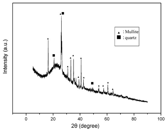 A compound cementitious system composed of P·II 52.5 type Portland Cement (Onada Cement Corp, Nanjing, China) and Class II fly ash (Ordos, China) was used in this experiment. Table 1 shows the chemical composition of cement and fly ash. Figure 2 presents the XRD pattern of fly ash. The physical properties and the particle size distribution of the expanded and vitrified small ball (EVSB) are listed in Table 2 and Table 3. Dry and clean quartz sand with a continuous particle size of 0.154–0.500 mm was used as aggregate for the mortar. Heavy calcium carbonate was used as the filling material, which has an average particle size of 0.0455 mm and a bulk density of 1080 kg/m3. The appearance of hydroxypropyl methylcellulose (HPMC) was white powder with three viscosities of 50,000 mPa·s, 100,000 mPa·s, and 150,000 mPa·s. The re-dispersible emulsion powder appeared as a white solid powder was the ethylene-vinyl acetate copolymer (EVA VINNAPAS-5011L). The length of the polypropylene fiber used in this experiment was 3 mm and 6 mm, respectively.
