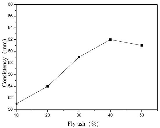 Replacing the cement with fly ash can reduce the use of cement, thereby reducing the costs. Studies have also shown that fly ash has a certain inhibitory effect on the drying shrinkage of mortar [37]. At the same time, the water requirement is reduced, which improves the workability of the mixture [39]. Figure 4 shows the relationship between the content of fly ash and the consistency of the mortar. It can be observed that fly ash can increase the consistency of the mortar through its approximately spherical glass microsphere particles. However, when the fly ash content was more than 40%, the consistency began to decrease, due to the smaller particle size and larger specific surface area of the fly ash.