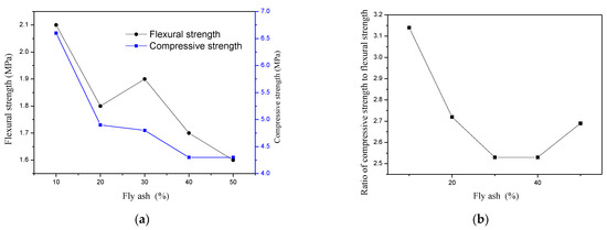 Influence of fly ash on the mechanical properties of mortars: (a) flexural strength and compressive strength, (b) ratio of compressive strength and flexural strength.