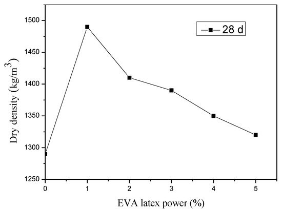 The results for the dry density, compressive strength, and flexural strength of the mortar samples that contained 0%, 1%, 2%, 3%, 4%, and 5% EVA are shown in Figure 6 and Figure 7. It can be seen that the dry density of the mortar with 1% EVA content was the largest. Compared to the mortar with 0% content, EVA can induce the aggregate to be evenly distributed inside the mortar, instead of floating on the surface. In this manner, packing is denser. However, as the EVA content continued to increase, the dry density of the mortar decreased, and the dry density of the mortar with an EVA content of 5% was similar to the control (0%). This was due to the air-entraining effect of the EVA, which caused an increase in porosity inside the mortar.