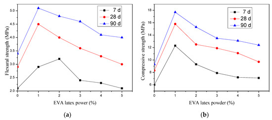 Influence of EVA on the mechanical properties of mortars: (a) flexural strength, (b) compressive strength.