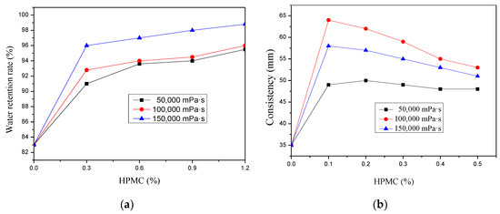 HPMC is a non-ionic water-soluble organic polymer with hydrophilic hydroxyl and ether bonds in its molecular structure. The water molecules in mortar combine with the oxygen atoms on the hydroxyl group and the ether bond to form a hydrogen bond, and HPMC forms a gel with water, which makes the free water lose its fluidity [46]. Therefore, HPMC has a water retention effect. Figure 9a shows that when the HPMC (50,000 mPa·s) content is from 0% to 0.3%, the water retention rate of the mortar increased from 83.0% to 91.0%, and when the HPMC content was more than 0.6%, the water retention rate gently increased. The influence law of HPMC on mortar consistency in Figure 9b shows that regardless of the amount of the HPMC, this would have a great improvement effect on mortar consistency, and this has the best effect when the content is 0.1%. By comparing the effects of HPMC with the three kinds of viscosity, it can be found that water retention increases with the increase in HPMC viscosity, and HPMC, with a viscosity of 100,000 mPa·s has the most obvious effect of increasing consistency. Paweł Pichniarczyk [46] agrees that low viscosity cannot provide good performance.