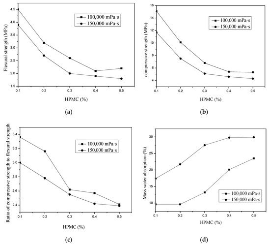 Figure 10a,b shows the relationship between the mechanical strength of the mortar at 28 days, and the different contents of HPMC with two different viscosities. Regardless of the content of HPMC, the mechanical strength of the mortar would significantly decrease. This is consistent with the results reported by many studies [10,49]. When the HPMC content was more than 0.3%, the downward trend of flexural and compressive strength tends to be gentle. However, at the same content, the mechanical strength of mortars mixed with HPMC with a viscosity of 100,000 mPa·s was higher, when compared to that with a viscosity of 150,000 mPa·s. The crack resistance of the mortar was evaluated using the compressive strength-flexural strength ratio. As shown in Figure 10c, as the content of HPMC increased, the ratio decreased and this improved the crack resistance. When the curves for the HPMC of both viscosities were at the 0.3% position, the slope of the line decreased, indicating that the degree of improvement in crack resistance decreased.