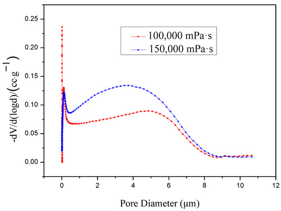 HPMC reduces the mechanical strength of cement mortar, which was mainly because HPMC introduces gas into the slurry. These gases form pores after the mortar hardens, which reduces the compactness of the mortar structure and thereby reduces the mechanical strength. The increase in water absorption in Figure 10d also proves the increase in pores inside the mortar. Chen Shi [49] agrees that although the introduction of pores reduces the strength, the excellent water retention capacity can improve the stability of ettringaite in the late age, thereby ensuring the development of late strength. Figure 11 shows the relationship between the pore size distribution of thermal insulation mortar and the viscosity of HPMC. It can be intuitively observed that the total pore volume of the mortar mixed with HPMC with a viscosity of 150,000 mPa·s was greater than the mortar mixed with HPMC with a viscosity of 100,000 mPa·s. The pore size of the former was relatively large, while the pore size of the latter was mainly distributed below 0.5 μm, and the pore size distribution was more uniform. This further shows that the greater the viscosity of HPMC, the more obvious the air-entraining effect.