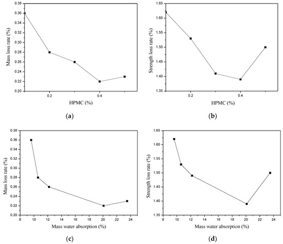 In order to reduce the influence of air entrainment on mechanical strength, HPMC with a viscosity of 100,000 mPa·s was selected, and the modified mortar with different dosages was used for 25 freeze-thaw cycles. The relationship between mass and strength loss rate and HPMC content is shown in Figure 12a,b, respectively. When the amount of HPMC was less than 0.4%, the greater the dosage, the lower the quality and strength loss of the mortar after 25 freeze-thaw cycles. The water absorption of the mortar can roughly reflect its air content. HPMC, as an air-entraining agent, improves the water absorption of mortars after being mixed. Figure 12c,d show the changes of the mass and strength loss with the water absorption rate after 25 freeze-thaw cycles on the mortar, respectively. The greater the water absorption rate of the mortar, the lower the loss rate of quality and strength. However, when the water absorption rate was greater than 20%, the loss rate increased.