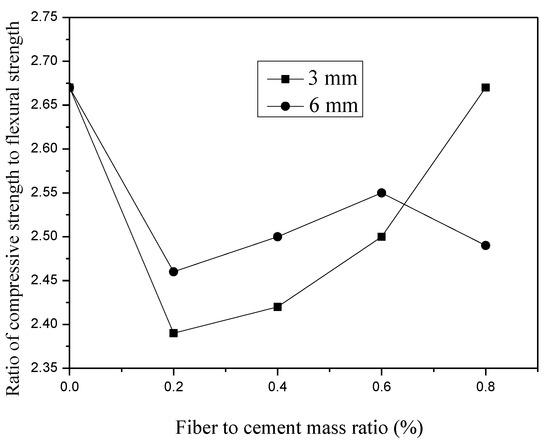 Effect of fiber on the compressive strength-to-flexural strength ratio of mortars.