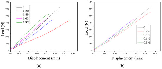 Load–displacement curve of the mortar: (a) 3-mm PP fiber, (b) 6-mm PP fiber.