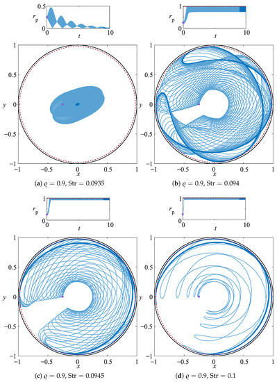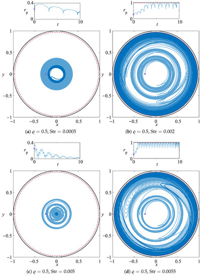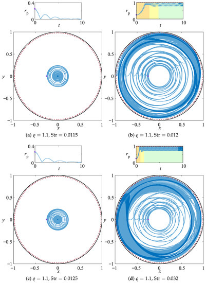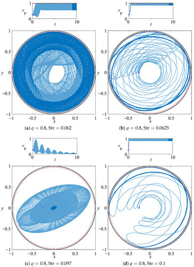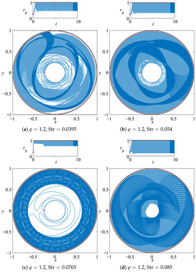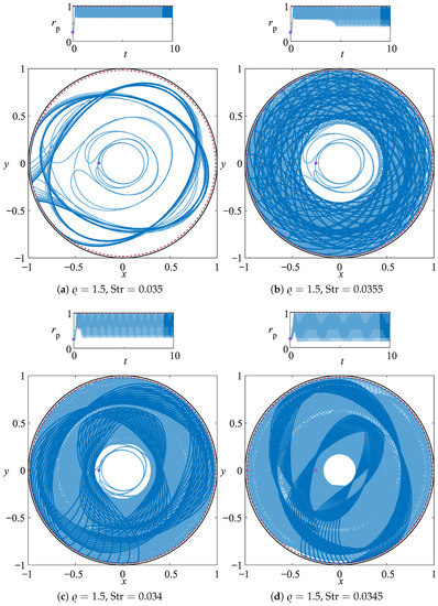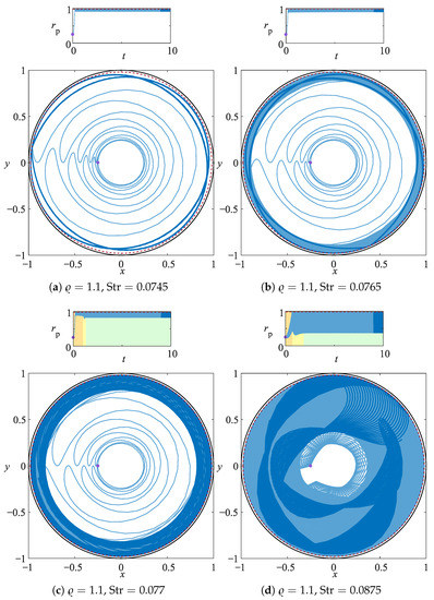 This same behaviour is observed for , , and . After an initial transient, the particle trajectory gets attracted by a complex rotating orbit (see Figure 3a, bottom panel) that penetrates radially almost up to (see Figure 3a, top panel). Increasing further the Strouhal number, i.e., for (see Figure 3b), the attraction manifold sharpens, it becomes linelike and periodic, and it does not rotate inside the cylindrical cavity. Increasing even further the Strouhal number the oscillatory centrifugation switches multiple times to an oscillatory centripetal motion and vice versa as demonstrated in Figure 3b–d. Once again for (see Figure 3d) a steady, periodic orbit is found with a characteristic shape qualitatively different from the limit cycle identified for .