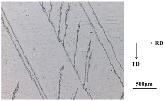 A 0.35 mm-thick commercial glassless grain-oriented silicon steel plate without a magnesium silicate layer was used as raw material to prepare the ultra-thin silicon steel. Its magnetic properties were B8 = 1.89 T, P1.7/50 = 1.12 W/kg, the average grain size was about 30 mm and the chemical compositions (mass fraction, %) were C: 0.0058, Si: 3, Mn: 0.0088, S: 0.0003, Al: 0.005, N: 0.001, Sn: 0.1. After being pickled with hydrochloric acid to distinguish the original grain boundaries, the sample plates of 300 mm (along rolling direction, RD) × 40 mm (along transverse direction, TD) were cut into two parts, as shown in Figure 1. The parts marked by the red block diagram are 10 mm (RD) × 5 mm (TD) and were used to confirm the initial orientation of the marked grains. The analysis was done using a Zeiss GeminiSEM500 field emission scanning electron microscope (SEM) equipped with an EBSD system and the accelerating voltage was 20 KV when measured. EBSD data was post-processed by the HKL CHANNEL5 software. The part marked by the green block is 300 mm (RD, rolling direction) ×30 mm (TD, transverse direction) and was cold rolled to 0.21–0.075 mm thick to investigate the twinning behavior. The microstructures and microtextures at different reductions were characterized and evaluated with a Confocal laser scanning microscope (CLSM) and EBSD technique, respectively. For the EBSD measurements, the samples were machined and electropolished with a 5% perchloric acid/alcohol solution to remove the surface strain layer. In the EBSD data, the tolerance angles for the orientations are set as 15°.