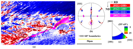 EBSD measurement of 0.075 mm sheet in transverse plane with step size = 0.2 μm: (a) EBSD orientation image mapping; (b) {111} pole figure; (c) rotation axes distribution for misorientation angle of 55–65˚ in (a).