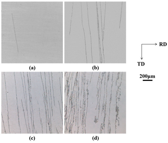 The morphology of deformation twinning within Goss-oriented grains at different reductions in rolling plane. (a) 32%; (b) 41%; (c) 53%; (d) 78% reduction.