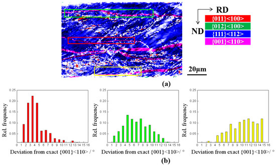 EBSD measurement in deformation twinning area of exact Goss orientated grains with a reduction of 78% in transverse plane with step size = 0.3 μm: (a) orientation image mapping; (b) the distribution of the deviation degree between twinning orientation and exact Goss orientation in the area marked by different color block diagram in (a).