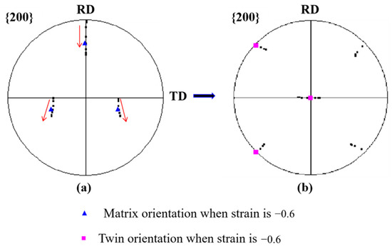 The calculation results suggest that during cold rolling, Goss orientation rotates to {111}<112> orientation along the route indicated by red arrows in Figure 6a, which is consistent with the literature [27]. In the calculated deformed matrix, the twinning orientations can be predicted based on the maximum Schmid factor and shear mechanical work of the twinning systems, as shown in Figure 6b. The orientation of the twinning forming during the cold rolling of Goss oriented grains is always α-fiber, close to {001}<110> orientation but with different degree of deviation. This is in good agreement with the experimental results, suggesting that twinning can occur in Goss oriented grains across a cold rolling process. The twinning orientation of exactly {001}<110> is achieved when the strain is about –0.6 and the deformed matrix orientation is (18° 48° 153°). Since most twins have orientations of exact or close to {001}<110>, we predict that twins mainly formed at this strain.
