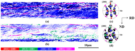 The microstructures of the grains with a 3° angle deviated from exact Goss orientation at different reductions are depicted in Figure 4. The microstructure and microtextures at 78% reduction measured with EBSD are shown in Figure 5. With the increase of deformation reduction, the area fraction of twins increases. When the deformation reduction reaches 78%, the edge serration of the twins becomes more prominent. Twins with three different deviation angles from exact {001} <110> orientation are observed in Figure 5a, and it is suggested that they were formed at different deformation stages during cold-rolling.