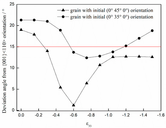 The crystal rotation routes of 10° deviated Goss orientation (0° 35° 0°) during cold rolling were simulated using VPSC model. Meanwhile, the Schmid factor and shear mechanical work as well as twinning orientation of the twinning systems were calculated in matrices with various orientations at different strain values. The results are shown in Figure 9 and Table 2. During cold rolling, the crystal rotation routes of grains with deviated Goss orientation are similar to that of exact Goss grains, showing deviated {111}<112> orientation at 78% rolling reduction. Moreover, under the same strain, the twining Schmid factor and shear mechanical work in deviated grains are both lower than that of exact Goss oriented grains. In a deviated Goss grain, the twins generally have a deviation angle with the exact {001}<110> orientation. The relationship of this deviation angle with {001}<110> orientation and strain is analyzed and the simulated results are presented in Figure 10. At the same strain, the twins in the initial deviated Goss grains have twinning orientation further away from the exact {001} <110> orientation. Since twinning systems are critical for achieving the final microstructures in ultra-thin grain-oriented silicon steel, the deviation degree of initial Goss oriented grain, therefore, would influence the evolution of the microstructure and microtextures of recrystallized steel. This influence is subject to future study.