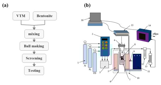 (a) The preparation process of vanadium–titanium magnetite (VTM) pellets. (b) Schematic of the experimental apparatus: 1—gas cylinder, 2—flow control cabinet, 3—gas mixing chamber, 4—reactor, 5—fever zone, 6—alundum tube, 7—corundum ball, 8—oxidized VTM pellets, 9—thermocouple, 10—tube furnace, 11—temperature controlling cabinet, 12—wash bottle, 13—drying bottle, 14—coal gas analyzer, 15—electronic balance, 16—computer.
