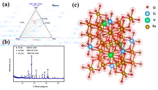 The results showed that the main phases in the pellets were TTM and ilmenite when the oxidation roasting temperature was low. With the increase of temperature, the XRD peak characterizing TTM disappeared while the peak of Fe2+ in XPS weakened and the peak of Fe3+ increased. TTH peaks appeared in large numbers. The combination of XRD and XPS showed that the main phase was transformed into TTM and oxidized into TTH. Figure 9a,b show the crystal structures of TTM and TTH. TTM is a cubic lattice and TTH is an orthorhombic six-sided lattice. The lattice structure of TTH is easier to reduce. Combined with the SEM of Figure 6, it can be seen that the calcination has achieved the polymerization and growth of the TTH lattice. The unit cell aggregates and grows and the crystal form changes from a relatively dispersed granular shape to a tight and strong structural interconnection. In addition to TTM, VTM raw materials also have isolated ilmenite (FeTiO3), which will be transformed into Fe2TiO5. The crystal structures of FeTiO3 and Fe2TiO5 are shown in Figure 9c,d. Finally, the oxidation process of VTM is described in the TiO2\FeO\Fe2O3 phase diagram as shown in Figure 7b. The phase transition in the oxidation process of VTM pellets is obtained.
