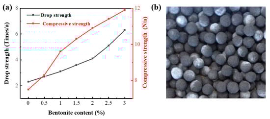 (a) Relationship between the amount of bentonite added and the falling strength/compressive strength of VTM pellets. (b) Photo of vanadium titanium magnetite pellets prepared with 1% bentonite.
