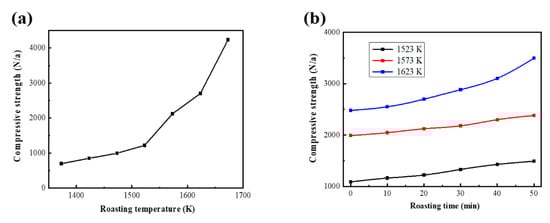 (a) Relationship between roasting temperature and compressive strength of VTM oxide pellet. (b) Relationship between roasting time and compressive strength of VTM oxide pellets.