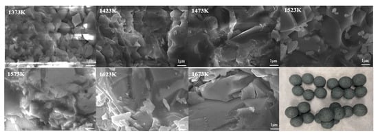 Figure 6 shows the SEM diagram of the cross-section of VTM oxidized pellets when the roasting temperature is 1373 to 1673 K. When the roasting temperature is 1373 K, granules can be observed obviously in the VTM oxidized pellets, indicating that the consolidation of VTM is very inadequate. Then, with the increase of roasting temperature, the compactness of VTM oxidized pellets gradually increased, indicating that the degree of intergranular fusion in VTM oxidized pellets gradually increased, making the compressive strength of VTM oxidized pellets greater. As shown in Figure 5, when the roasting temperature is 1623 K and the time is 20 min, the compressive strength of VTM oxidized pellets is 2699N/a pellet, which meets the requirements of direct reduction in a gas-based shaft furnace.