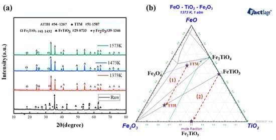 (a) XRD pattern of VTM oxide pellets after roasting from 1373 to 1573 K. (b) Phase changes during oxidation of VTM pellets.